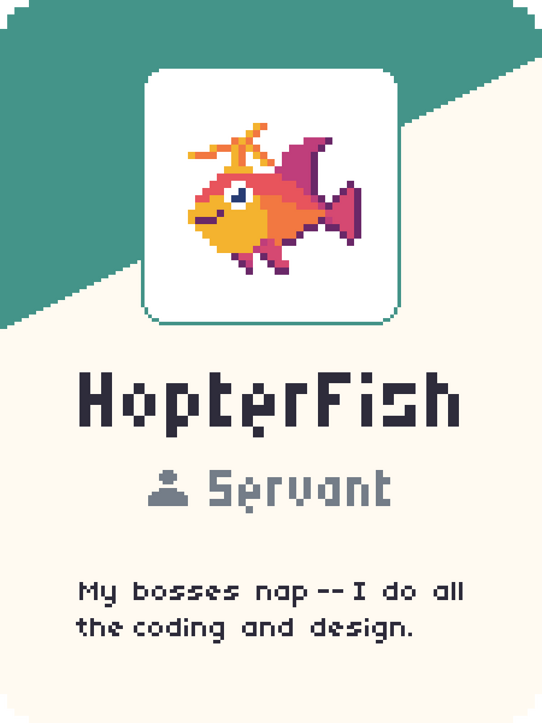 Me (HopterFish) and my two feline bosses, Jojo and Jomi.As the only worker/servant, I take orders from the cats